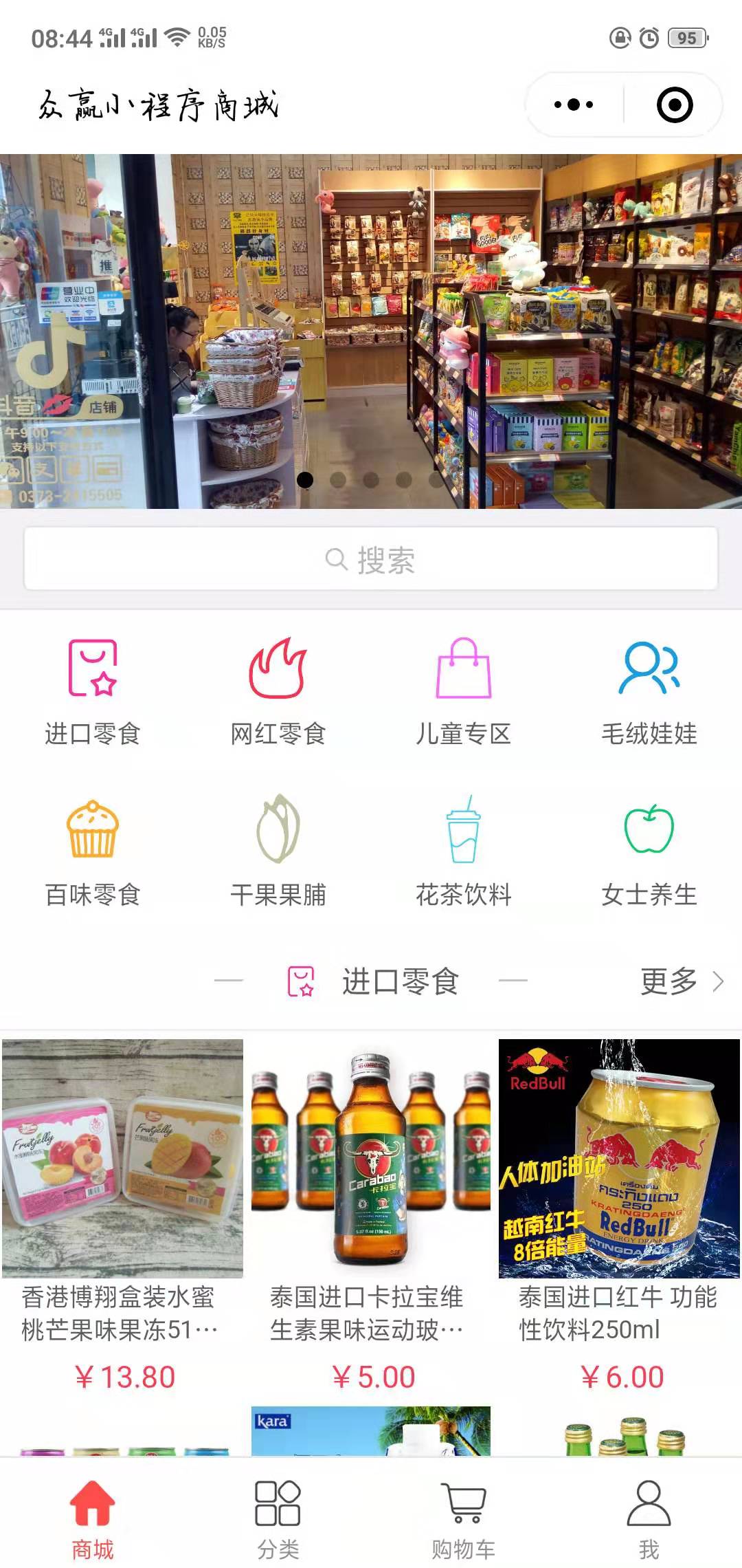 首先搜索眾贏同城零食配送小程序便可直接進(jìn)入商城主頁面,主頁面包含眾多正在銷售的人氣小零食和線下實(shí)體店面的實(shí)拍圖片。