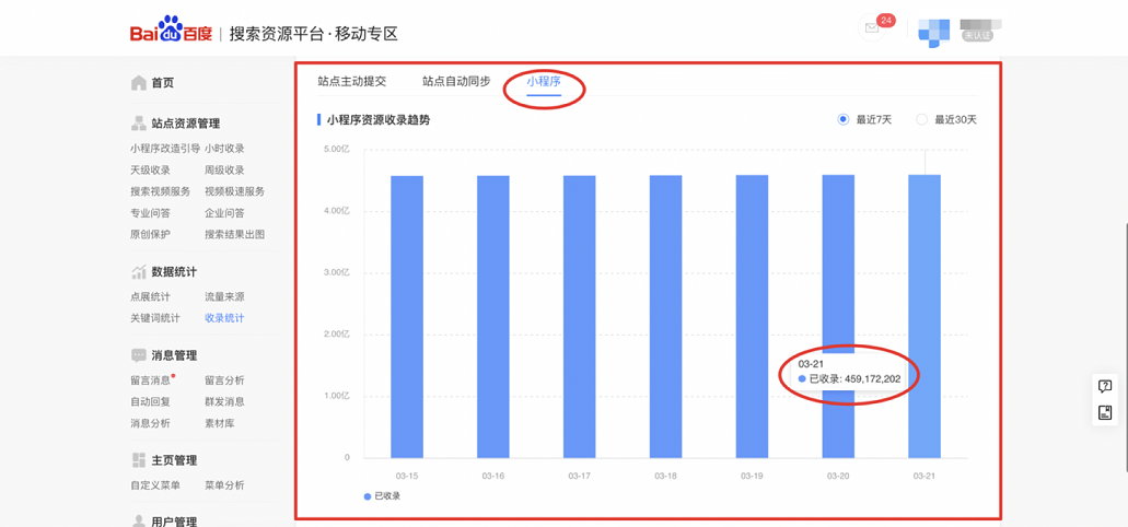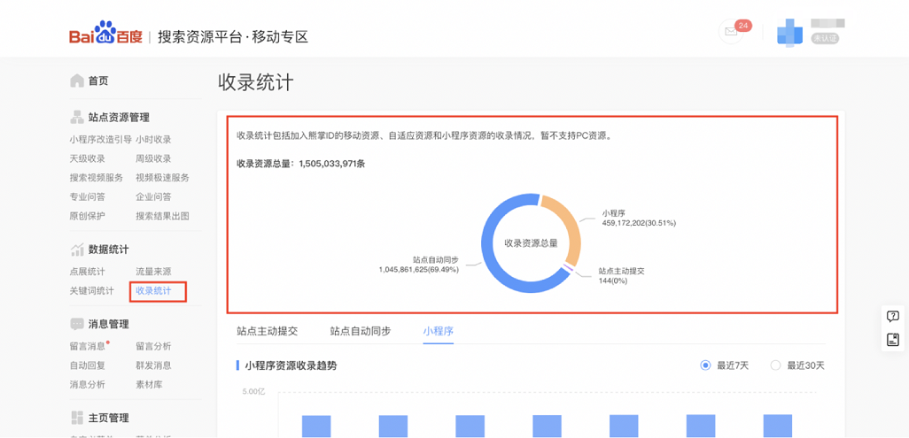 如下圖,您可在數(shù)據(jù)統(tǒng)計-收錄統(tǒng)計中查看小程序收錄資源量,以及在當前熊掌ID下小程序資源量占比。