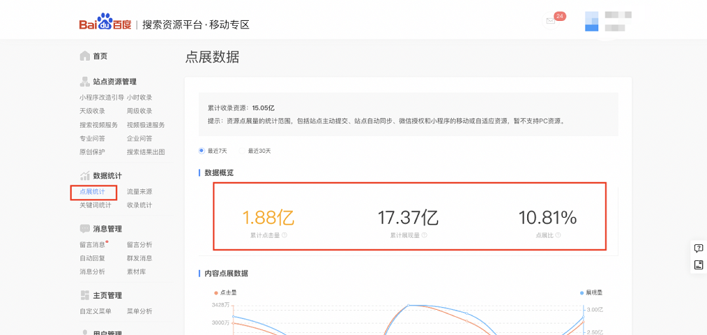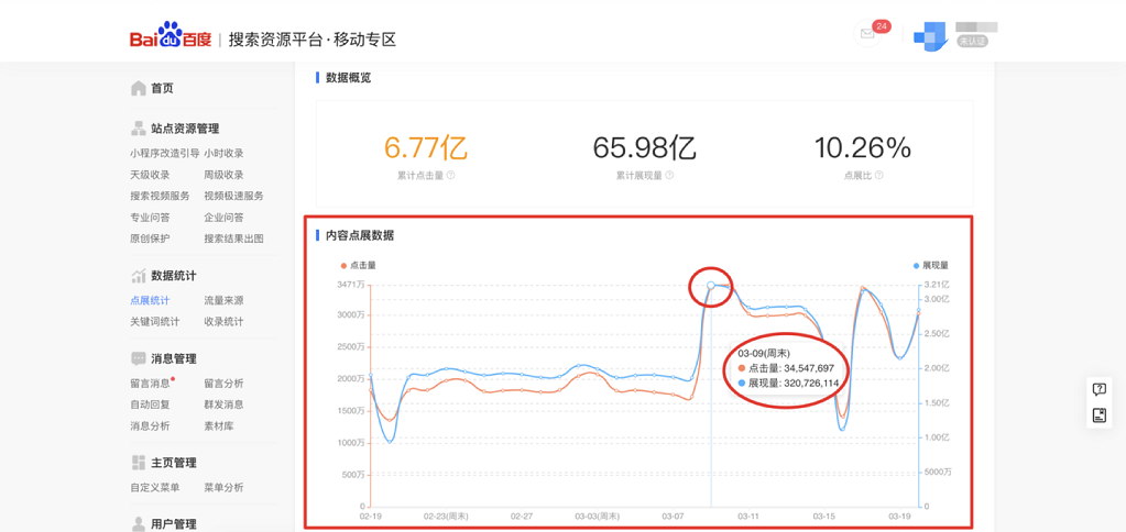 如下圖,您可在數(shù)據(jù)統(tǒng)計-點展統(tǒng)計中查看當前熊掌ID下所有資源的點擊和展現(xiàn)情況(從3月9日起開始包含小程序資源)。