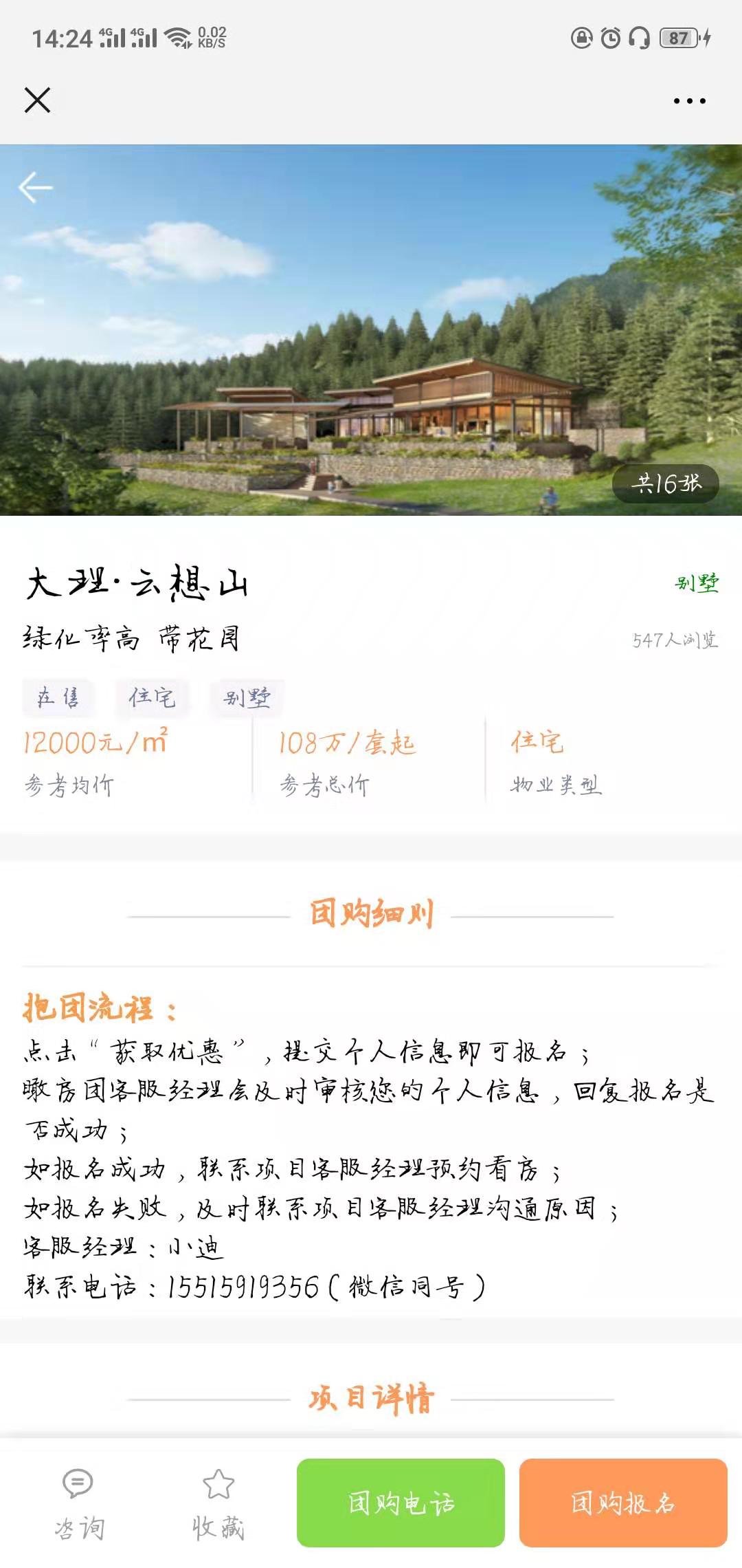 進(jìn)入選好的房子界面之后還可以看到房源的鳥瞰圖,項目詳情,戶型介紹,樓盤動態(tài)、房源配套信息等。最下面可以找客服咨詢房型的具體信息,而且還有團(tuán)購,獲取優(yōu)惠券等功能。